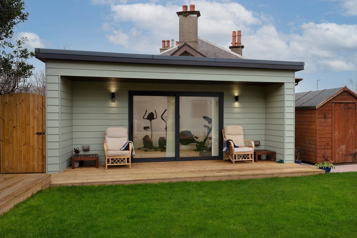 Contemporary extension with open plan kitchen, dining, living room formed with a vaulted ceiling and clerestory windows. Cedral composite cladding used externally to the extension and a new garden studio room.
